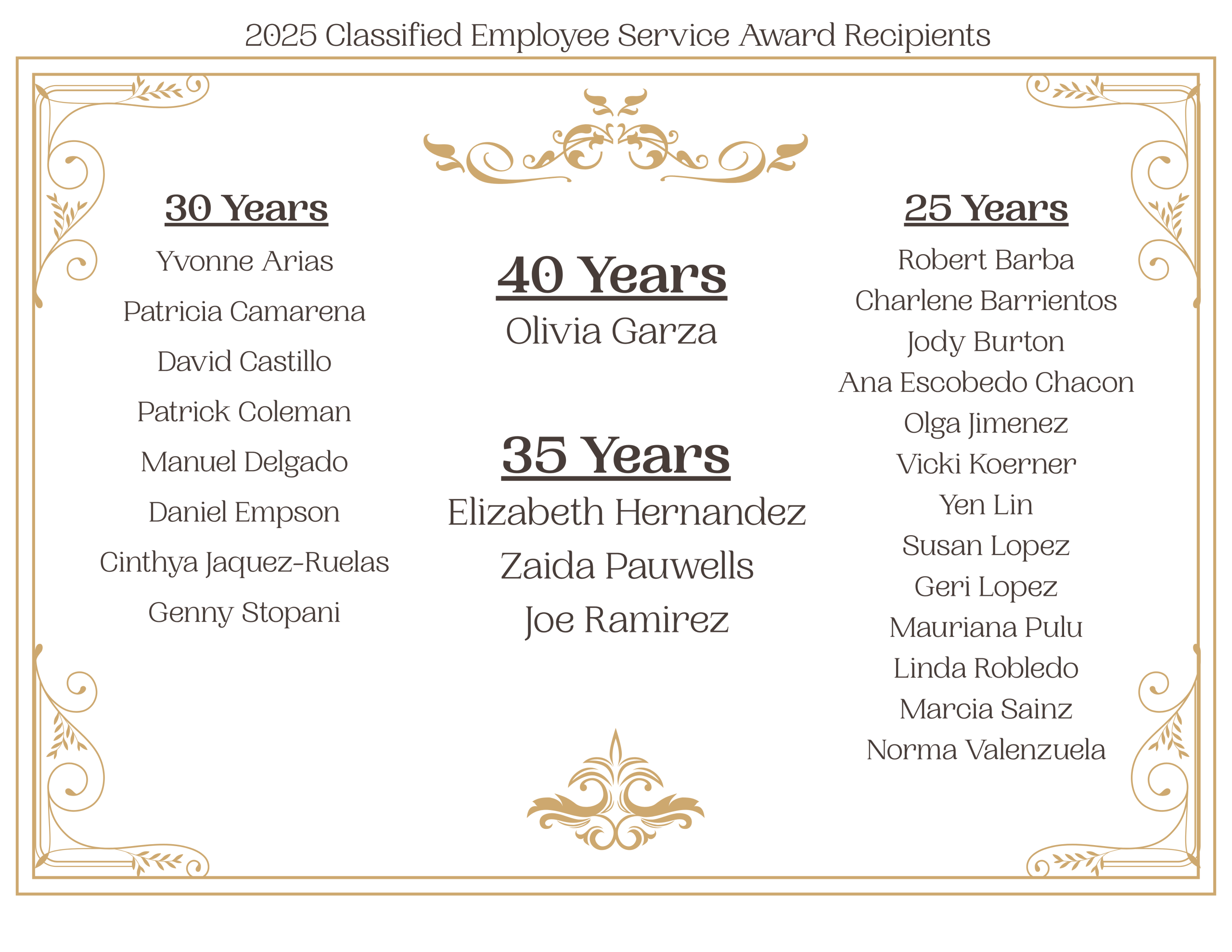The Office of the Personnel Commission hosts the annual Employee Service Awards celebration. Employee service awards are given to classified employees that have worked for the District for at least 10 years. Employees are given a service pin according to their years of service (10, 15, 20, 25, 30, 35, and 40). Classified employees work in the following job families: Clerical, Fiscal, Food Services, Human Resources, Instructional Support, Maintenance & Operations, Purchasing, Security, Technology Services, Transportation and the Warehouse. Please see our 2025 Employee Service Award recipients below by scrolling through the slide show. Congratulations and a BIG thank you to all of our service award recipients for their years of dedicated service to our students! Scroll down for a slideshow recipients and event photos.